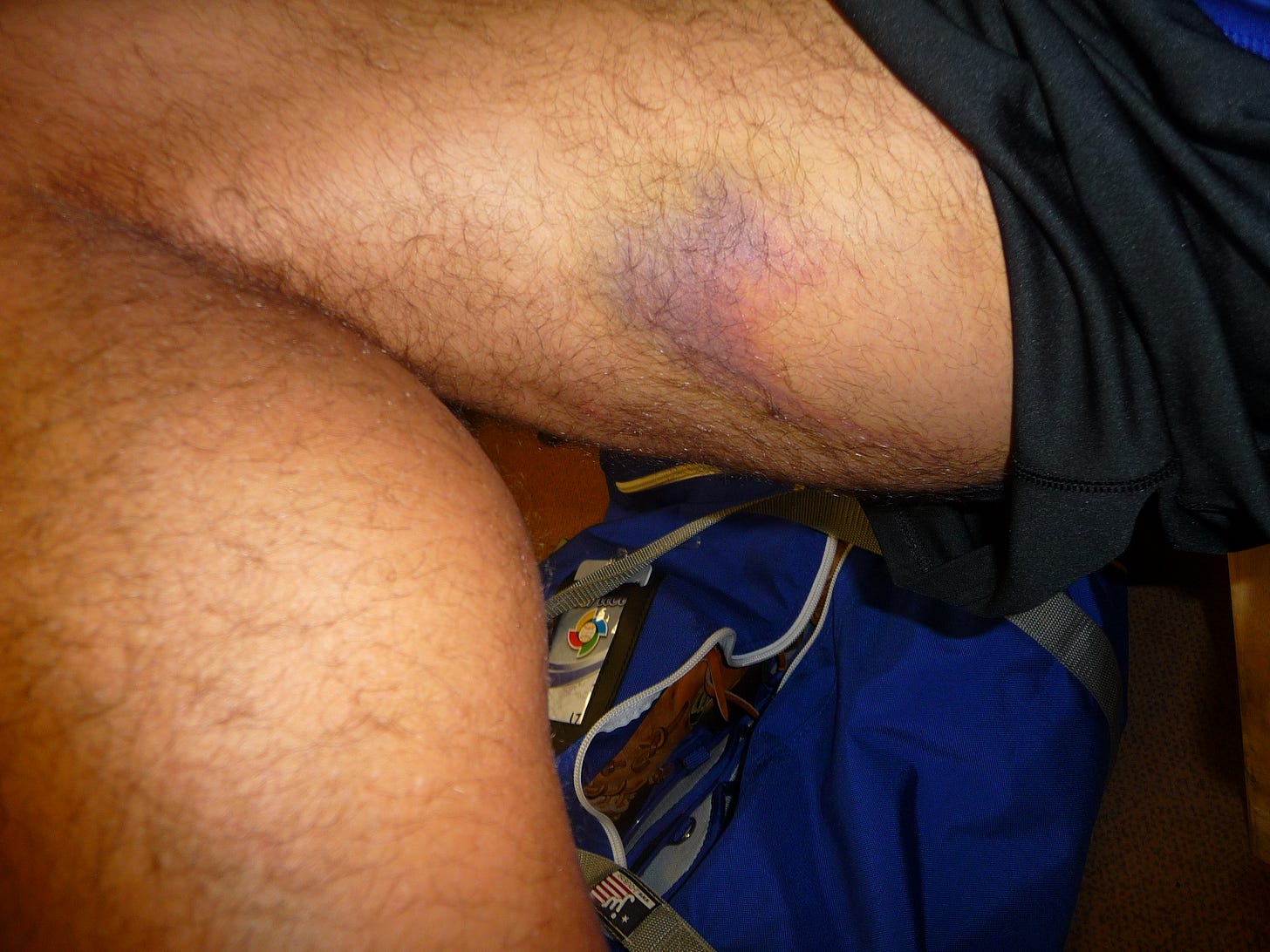 I caught the three innings and was removed from the game. Steve Hertz, our coach at the time, came up to me and said, "You're out of the game. You need me to tell you why?" I did not need him to tell me. I knew it was because I made the team and Brad wanted to save me for the real task, the Qualifier. For icing on the pain cake, I got a foul ball off my thigh in the last inning I caught. This mark was still left almost a week later.