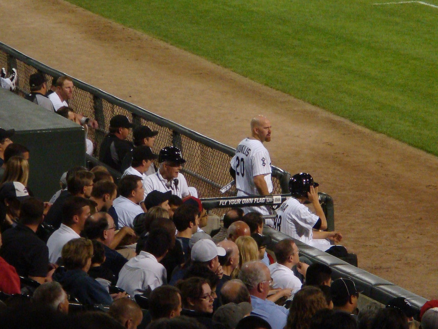 youk in the dugout He was 1 for 4 with a single and hit-by-pitch. Chamberlain hit him, again. Being a baseball genius, you can hear me say in the video below, "Watch for the hit-by-pitch here". And in the 2nd pitch of the at-bat, boom, he hit him. I will not say it was on purpose. It was a bad time to hit a guy. It was a tie game, 6-6, in the 7th inning, 1 out, no one on base, Dunn and Konerko coming up. But I will say, Major League pitchers do not miss that badly that often and Chamberlain has hit or almost hit Kevin a lot. The videos are short, just a few seconds. And they are not great. The first video is Strike 1. And the second is the hit-by-pitch. Strike 1 is a slider. The HBP is a fastball. Roll strike 1... [youtube=http://www.youtube.com/watch?v=2cvenM_Mea8&feature=youtu.be] And then... Listen, Joe calls it. We apologize in advance for the abrupt ending. We got a little fired up. [youtube=http://www.youtube.com/watch?v=PVBMTadV_q0&feature=youtu.be] Then Chamberlain threw over to first base twice to either give a guy in the bullpen time to warm-up, or to continue f------ with Kevin. Girardi agreed it was a bad time, and came out of the dugout and took Chamberlain out of the game. It is unusual to see someone removed after throwing a pick-off. Kevin hit a go-ahead grand-slam the following game.