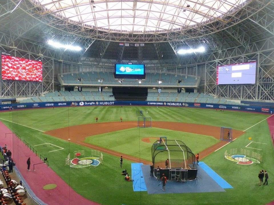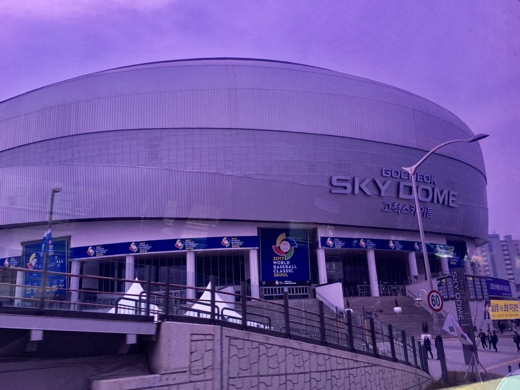 Wait, what? Ragtag? Wannabes? 200-1 odds? We thought we were pretty good. But the world didn't agree, it appeared. Our first game was against South Korea, the #3 ranked team in the world, in Seoul's Gocheok Sky Dome, home of the Nexen Heroes of the KBO, Korea's professional league, and one of the loudest baseball stadiums in the world when it gets rocking. It was a dump. Check it out...