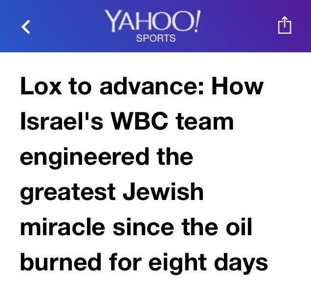 We did not a have a sense of the impact we were having in Israel and in Jewish communities around the world. We were in our bubble, in meetings and practices, getting ready for the games, and thought we were just doing what we should be doing, winning. But after the games, there were hundreds of messages from friends and family and total strangers. And the headlines were out of control. Check this one on Yahoo Sports...