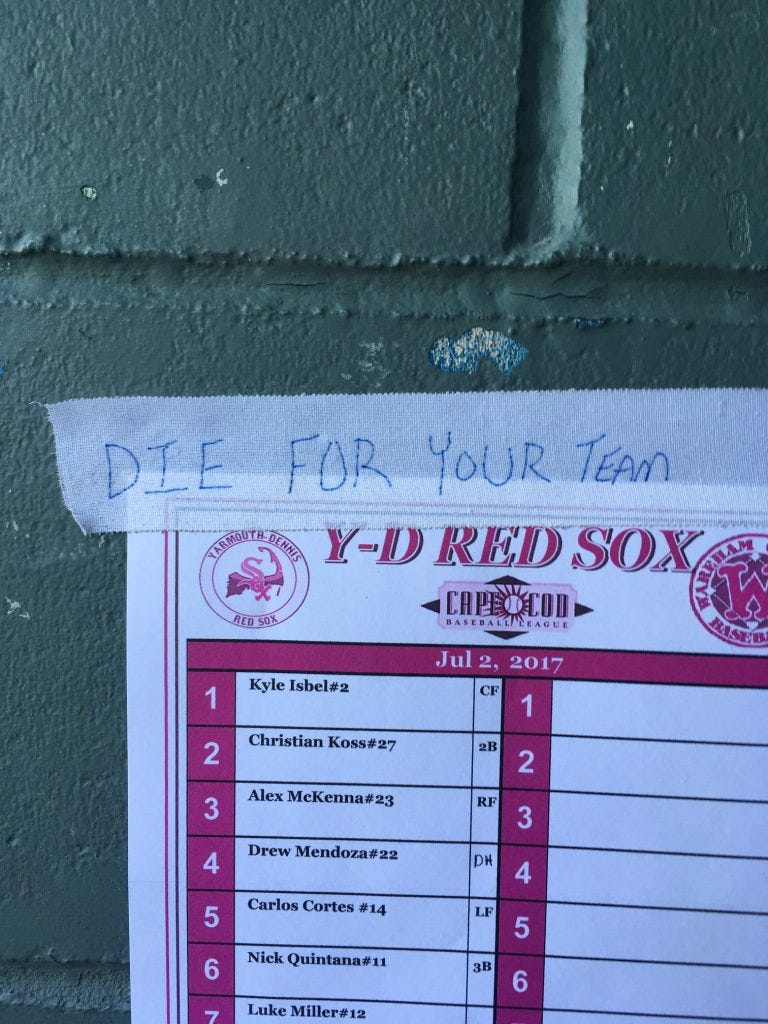 As you know, from your faithful readership, of course, I was in Cape Cod for the summer with the YD Red Sox, 3-time defending champs of the Cape Cod Baseball League, a new member of what will be known for many generations to come as DEFINITELY THE GREATEST COACHING STAFF OF ALL TIME EVER ASSEMBLED OF ALL TIME. It would be hard for me to describe the whole summer for you. We played nearly 50 games. We won. We lost. There were home runs and strike outs, errors and injuries, walks and walk-offs. So instead, using only the boundless power of my photogenic memory, and the somewhat less powerful capabilities of THE ENTIRE INTERNET, I will take you inside a single day of a coach for the 2017 Yarmouth-Dennis Red Sox.